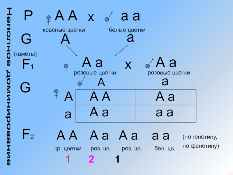 Неполное доминирование - форма взаимодействия, при которой у гетерозиготного организма (Аа) доминантный ген (А) не полностью подавляет рецессивный ген (а), вследствие чего проявляется промежуточный между родительскими признак. Здесь расщепление по генотипу и фенотипу совпадает и составляет 1:2:1