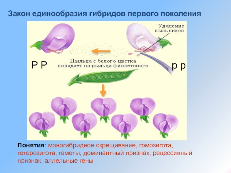 Понятия: моногибридное скрещивание, гомозигота, гетерозигота, гаметы, доминантный признак, рецессивный
