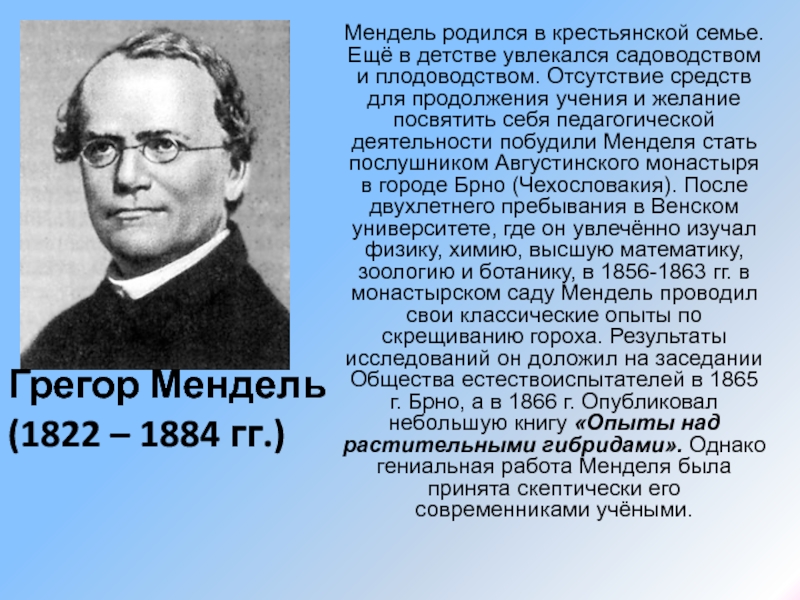 себя педагогической деятельности побудили Менделя стать послушником Августинского монастыря в городе Брно (Чехословакия). После двухлетнего пребывания в Венском университете, где он увлечённо изучал физику, химию, высшую математику, зоологию и ботанику, в 1856-1863 гг. в монастырском саду Мендель проводил свои классические опыты по скрещиванию гороха. Результаты исследований он доложил на заседании Общества естествоиспытателей в 1865 г. Брно, а в 1866 г. Опубликовал небольшую книгу «Опыты над растительными гибридами». Однако гениальная работа Менделя была принята скептически его современниками учёными.