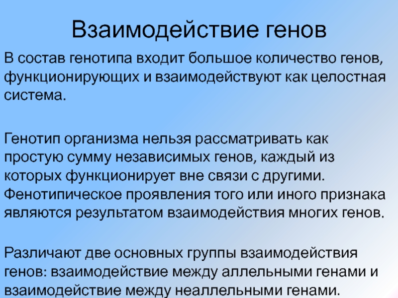 независимых генов, каждый из которых функционирует вне связи с другими. Фенотипическое проявления того или иного признака являются результатом взаимодействия многих генов.
