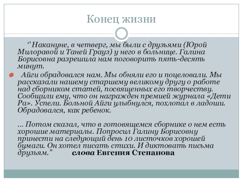 … Потом сказал, что в готовящемся сборнике о нем есть хорошие материалы. Попросил Галину Борисовну принести на следующий день 10 листочков хорошей бумаги. Он хотел писать стихи. И диктовать письма друзьям.’’ слова Евгения Степанова