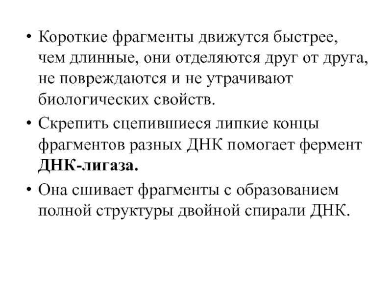 Слайд 20Короткие фрагменты движутся быстрее, чем длинные, они отделяются друг от