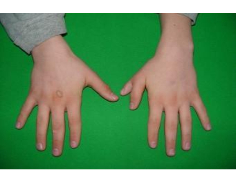 ладонная складка, одна – на 5м пальце, мышечный гипертонус, гипертелоризм, пороки сердца и др.
