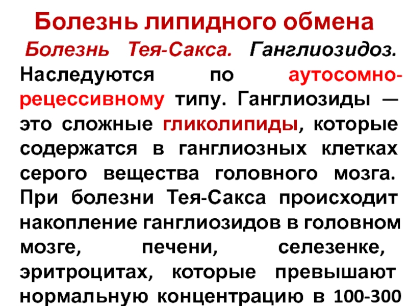 вещества головного мозга. При болезни Тея-Сакса происходит накопление ганглиозидов в головном мозге, печени, селезенке, эритроцитах, которые превышают нормальную концентрацию в 100-300 раз.