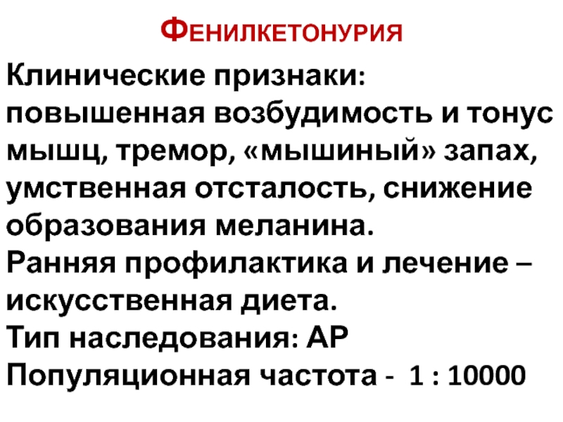 Клинические признаки: повышенная возбудимость и тонус мышц, тремор, «мышиный» запах,