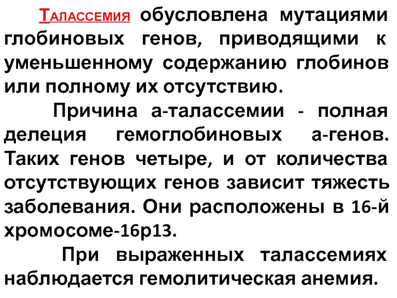 Слайд 26 Талассемия обусловлена мутациями глобиновых генов, приводящими к уменьшенному