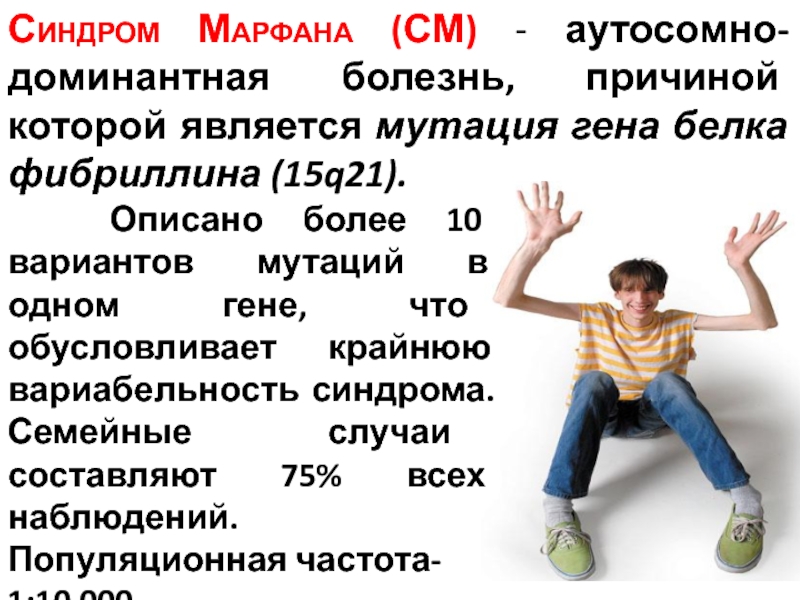 Синдром Марфана (СМ) - аутосомно-доминантная болезнь, причиной которой является мутация гена белка фибриллина (15q21).