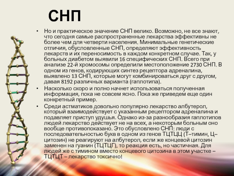 четверти населения. Минимальные генетические отличия, обусловленные СНП, определяют эффективность лекарств и их переносимость в каждом конкретном случае. Так, у больных диабетом выявили 16 специфических СНП. Всего при анализе 22-й хромосомы определили местоположение 2730 СНП. В одном из генов, кодирующих синтез рецептора адреналина, выявлено 13 СНП, которые могут комбинироватьcя друг с другом, давая 8192 различных варианта (гаплотипа).