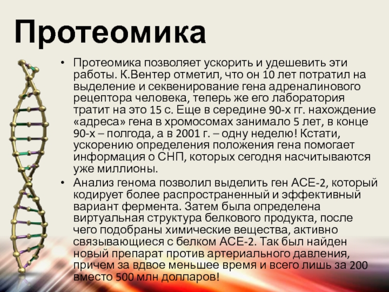 Анализ генома позволил выделить ген АСЕ-2, который кодирует более распространенный и эффективный вариант фермента. Затем была определена виртуальная структура белкового продукта, после чего подобраны химические вещества, активно связывающиеся с белком АСЕ-2. Так был найден новый препарат против артериального давления, причем за вдвое меньшее время и всего лишь за 200 вместо 500 млн долларов!
