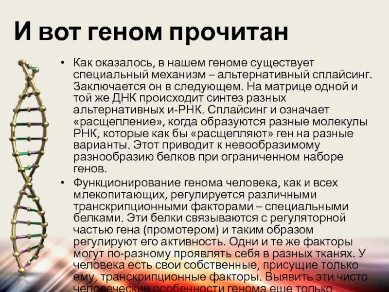 Функционирование генома человека, как и всех млекопитающих, регулируется различными транскрипционными факторами – специальными белками. Эти белки связываются с регуляторной частью гена (промотером) и таким образом регулируют его активность. Одни и те же факторы могут по-разному проявлять себя в разных тканях. У человека есть свои собственные, присущие только ему, транскрипционные факторы. Выявить эти чисто человеческие особенности генома еще только предстоит ученым.