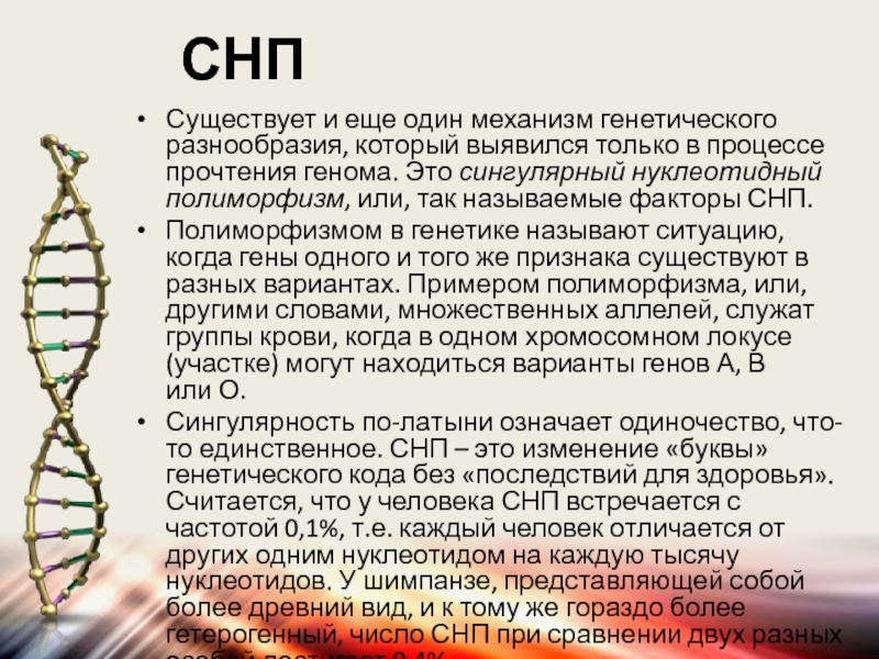 Сингулярность по-латыни означает одиночество, что-то единственное. СНП – это изменение «буквы» генетического кода без «последствий для здоровья». Считается, что у человека СНП встречается с частотой 0,1%, т.е. каждый человек отличается от других одним нуклеотидом на каждую тысячу нуклеотидов. У шимпанзе, представляющей собой более древний вид, и к тому же гораздо более гетерогенный, число СНП при сравнении двух разных особей достигает 0,4%.