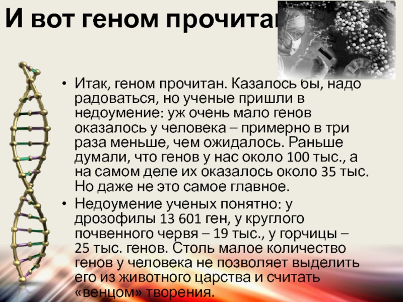 у человека – примерно в три раза меньше, чем ожидалось. Раньше думали, что генов у нас около 100 тыс., а на самом деле их оказалось около 35 тыс. Но даже не это самое главное.
