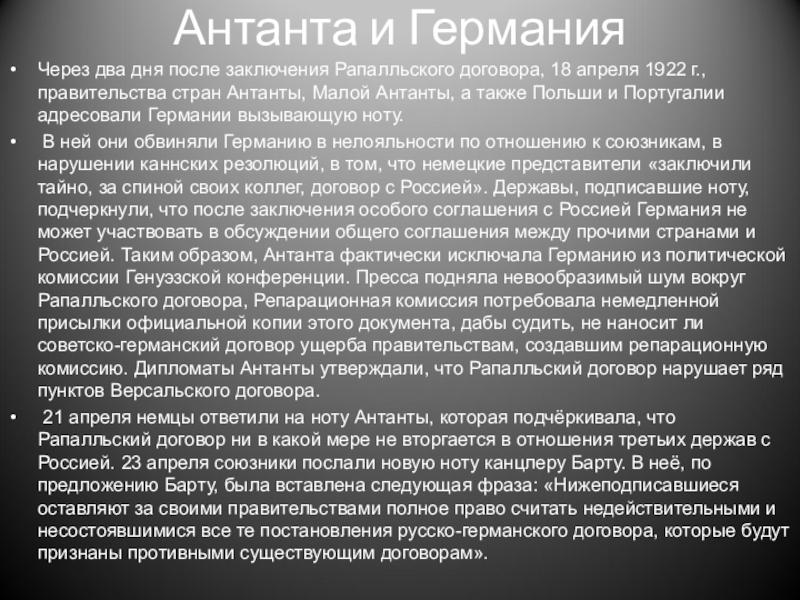 В ней они обвиняли Германию в нелояльности по отношению к союзникам, в нарушении каннских резолюций, в том, что немецкие представители «заключили тайно, за спиной своих коллег, договор с Россией». Державы, подписавшие ноту, подчеркнули, что после заключения особого соглашения с Россией Германия не может участвовать в обсуждении общего соглашения между прочими странами и Россией. Таким образом, Антанта фактически исключала Германию из политической комиссии Генуэзской конференции. Пресса подняла невообразимый шум вокруг Рапалльского договора, Репарационная комиссия потребовала немедленной присылки официальной копии этого документа, дабы судить, не наносит ли советско-германский договор ущерба правительствам, создавшим репарационную комиссию. Дипломаты Антанты утверждали, что Рапалльский договор нарушает ряд пунктов Версальского договора.