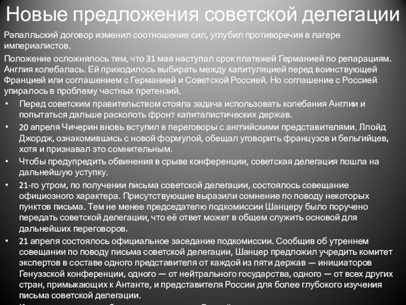 установить мир. Он подчеркнул, что экономическое восстановление России как крупнейшей державы, обладающей неисчислимыми запасами природных богатств, является непременным условием всеобщего экономического восстановления. Советская делегация принимает к сведению и признаёт в принципе положения каннской резолюции, сохраняя, однако, за собой право внесения в неё как поправок, так и дополнительных пунктов. Вместе с тем Чичерин отметил, что все попытки восстановления хозяйства будут возможны, если не будет угрозы войны. Установление такого всеобщего мира может быть осуществлено всемирным конгрессом.