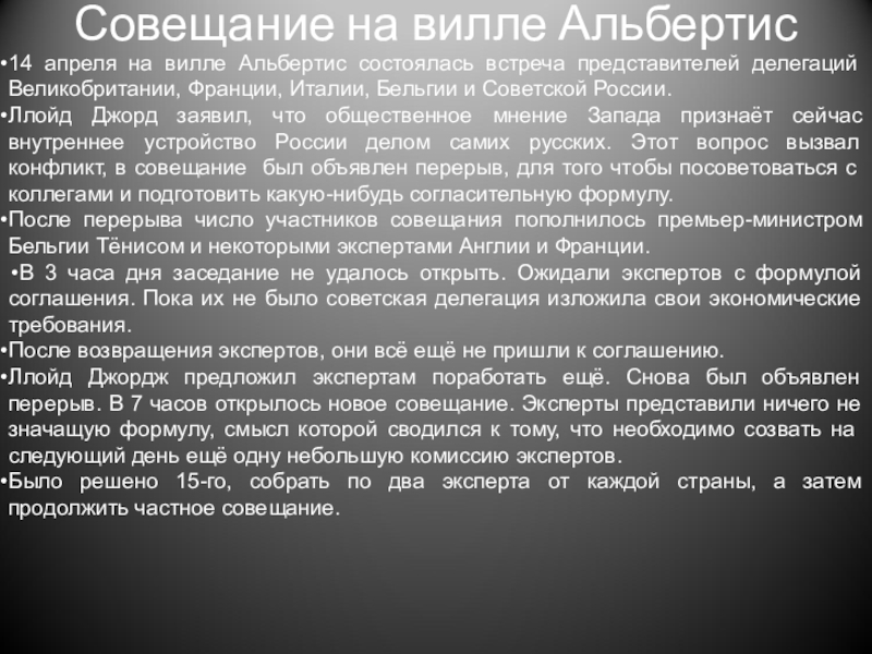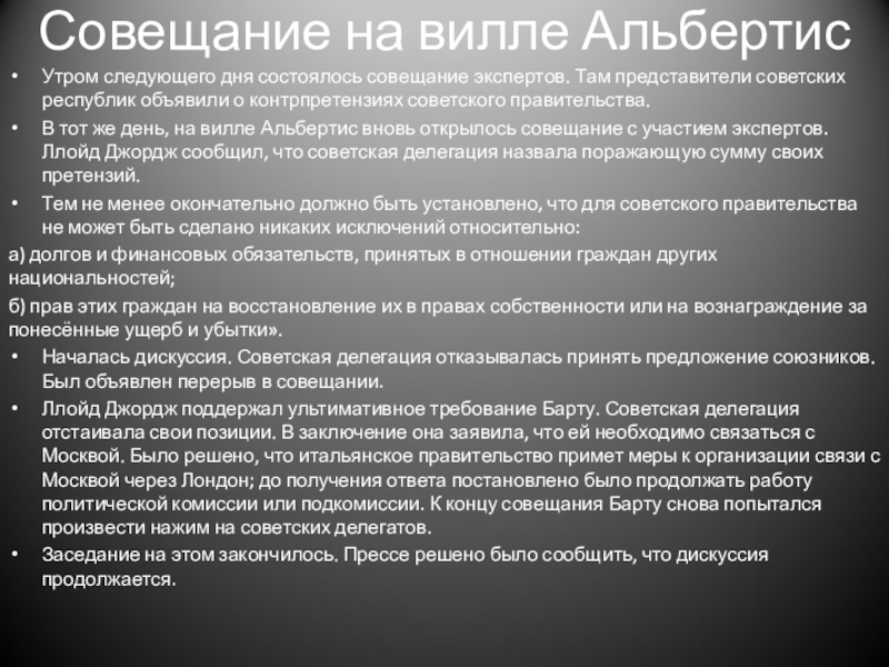 же день, на вилле Альбертис вновь открылось совещание с участием экспертов. Ллойд Джордж сообщил, что советская делегация назвала поражающую сумму своих претензий.