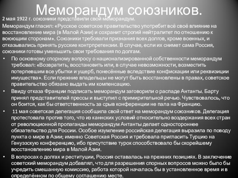 мира (в Малой Азии) и сохранит строгий нейтралитет по отношению к воюющим сторонам». Союзники требовали признания всех долгов, кроме военных, и отказывались принять русские контрпретензии. В случае, если их снимет сама Россия, союзники готовы уменьшить свои требования по долгам.