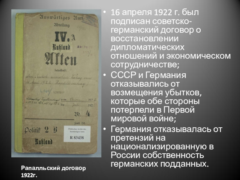 16 апреля 1922 г. был подписан советско-германский договор о восстановлении