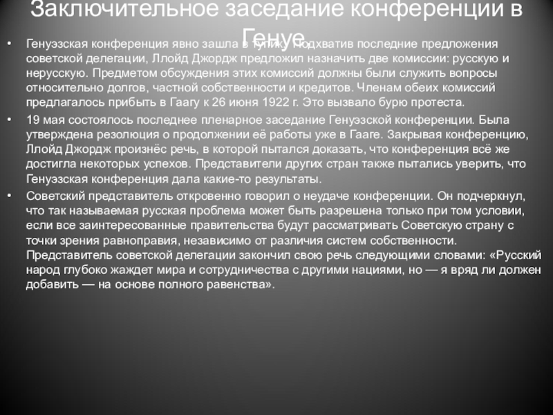 Советский представитель откровенно говорил о неудаче конференции. Он подчеркнул, что так называемая русская проблема может быть разрешена только при том условии, если все заинтересованные правительства будут рассматривать Советскую страну с точки зрения равноправия, независимо от различия систем собственности. Представитель советской делегации закончил свою речь следующими словами: «Русский народ глубоко жаждет мира и сотрудничества с другими нациями, но — я вряд ли должен добавить — на основе полного равенства».