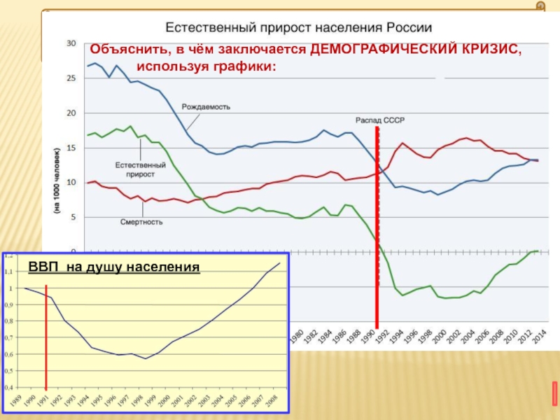 ВВП на душу населенияОбъяснить, в чём заключается ДЕМОГРАФИЧЕСКИЙ КРИЗИС,       используя графики: