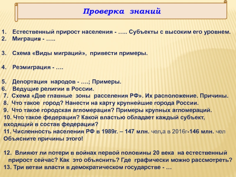 Проверка знанийЕстественный прирост населения - ….. Субъекты с высоким его уровнем.Миграция - …..Схема «Виды миграций», привести примеры.Реэмиграция