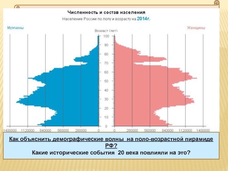 Слайд 14Как объяснить демографические волны на поло-возрастной пирамиде РФ?