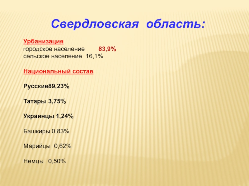 Урбанизация	городское население    83,9%	сельское население	16,1% Национальный состав	Русские	89,23%	Татары	3,75%	Украинцы 1,24%	Башкиры 0,83%	Марийцы 0,62%	Немцы	0,50% Свердловская область:
