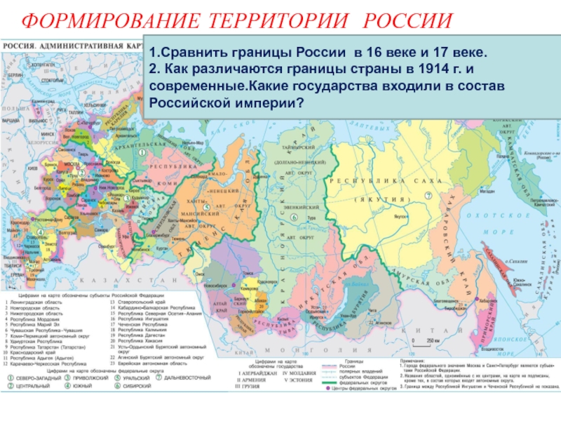ФОРМИРОВАНИЕ ТЕРРИТОРИИ РОССИИ1.Сравнить границы России в 16 веке и 17 веке.2. Как различаются границы страны в 1914 г. и современные.Какие государства входили в состав Российской империи?