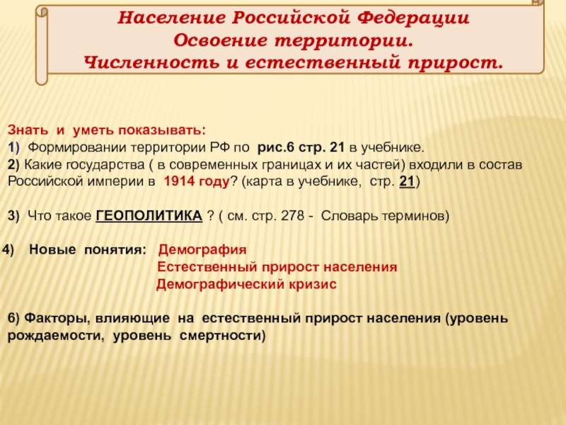 Население Российской ФедерацииОсвоение территории.Численность и естественный прирост.Знать и уметь показывать: 1) Формировании территории РФ по рис.6 стр.
