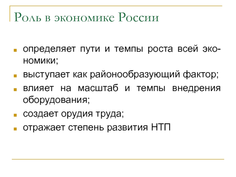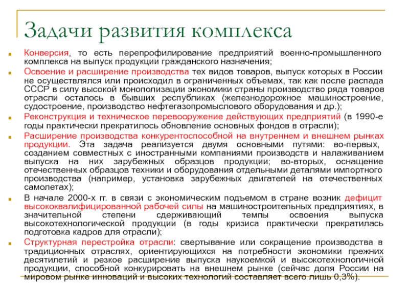 Структурная перестройка отрасли: свертывание или сокращение производства в традиционных отраслях, ориентирующихся на потребности экономики прежних десятилетий и резкое расширение выпуска наукоемкой и высокотехнологичной продукции, способной конкурировать на внешнем рынке (сейчас доля России на мировом рынке инноваций и высоких технологий составляет всего лишь 0,3%).