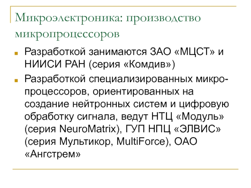 обработку сигнала, ведут НТЦ «Модуль» (серия NeuroMatrix), ГУП НПЦ «ЭЛВИС» (серия Мультикор, MultiForce), ОАО «Ангстрем»