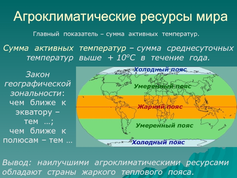 Вывод: наилучшими агроклиматическими ресурсами обладают страны жаркого теплового пояса.