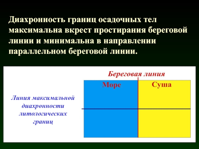 Слайд 23Диахронность границ осадочных тел максимальна вкрест простирания береговой линии и