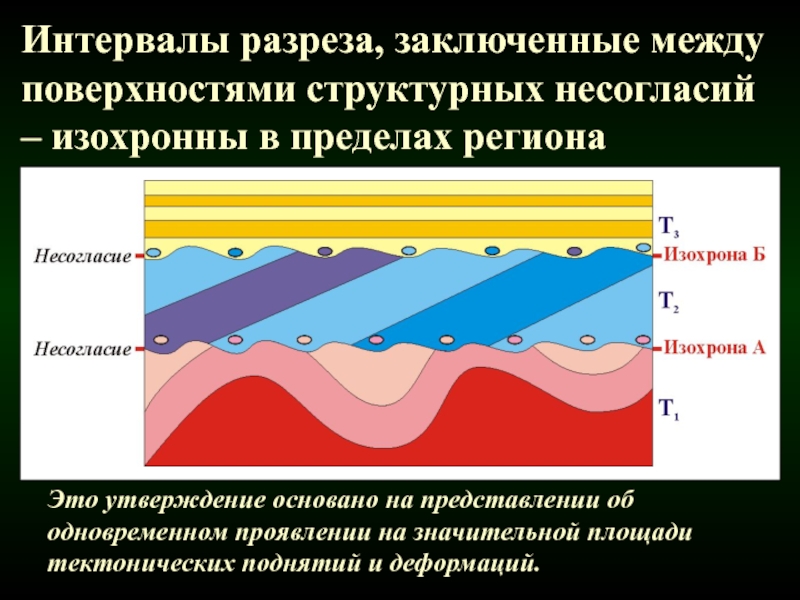 Слайд 26Интервалы разреза, заключенные между поверхностями структурных несогласий – изохронны в
