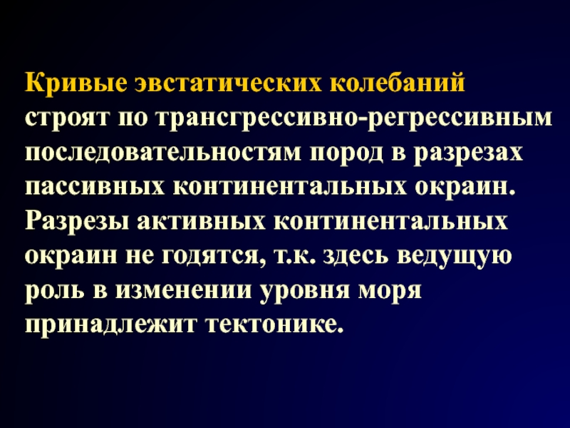 Слайд 44Кривые эвстатических колебаний строят по трансгрессивно-регрессивным последовательностям пород в разрезах