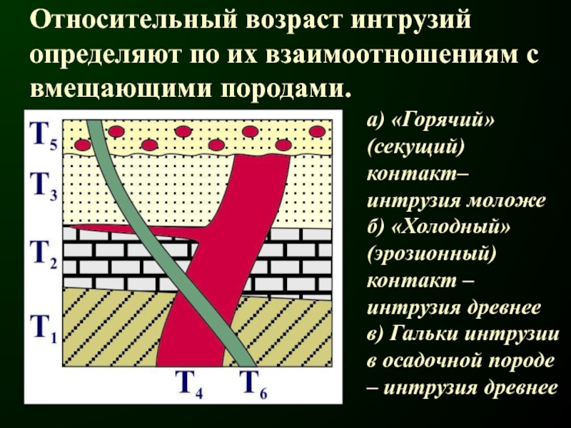 Слайд 25Относительный возраст интрузий определяют по их взаимоотношениям с вмещающими породами.