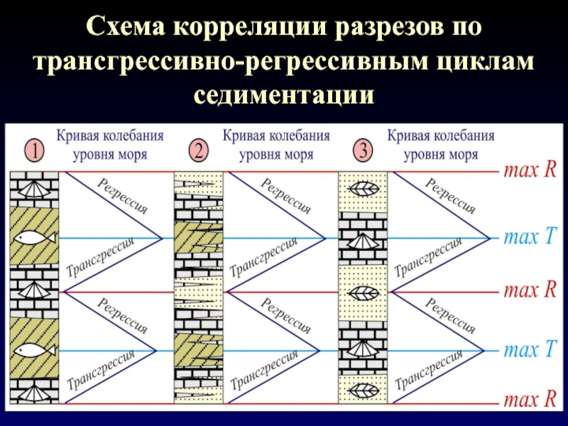 Слайд 32Корреляция разрезов по трансгрессивно-регрессивным циклам седиментации