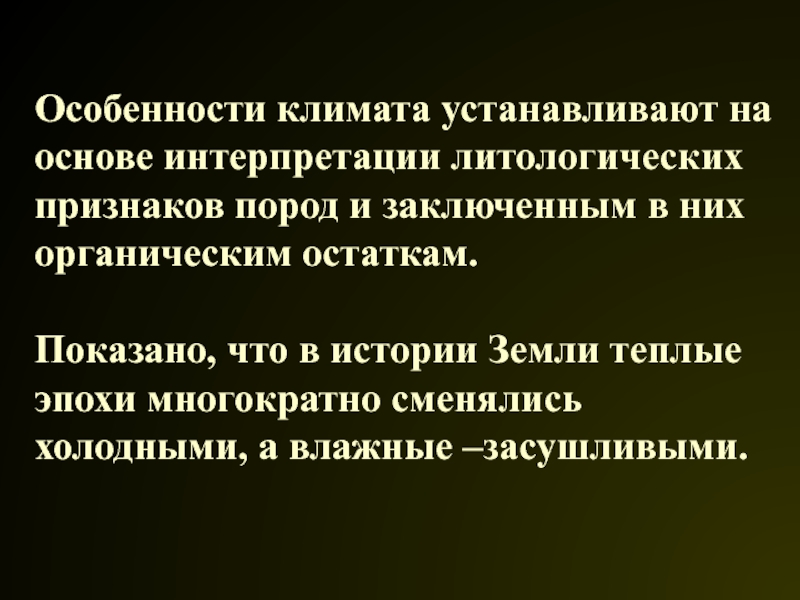 Слайд 48Особенности климата устанавливают на основе интерпретации литологических признаков пород и