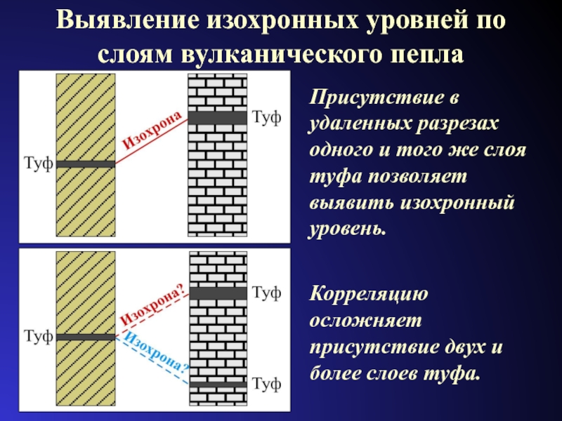 Слайд 28Выявление изохронных уровней по слоям вулканического пепла