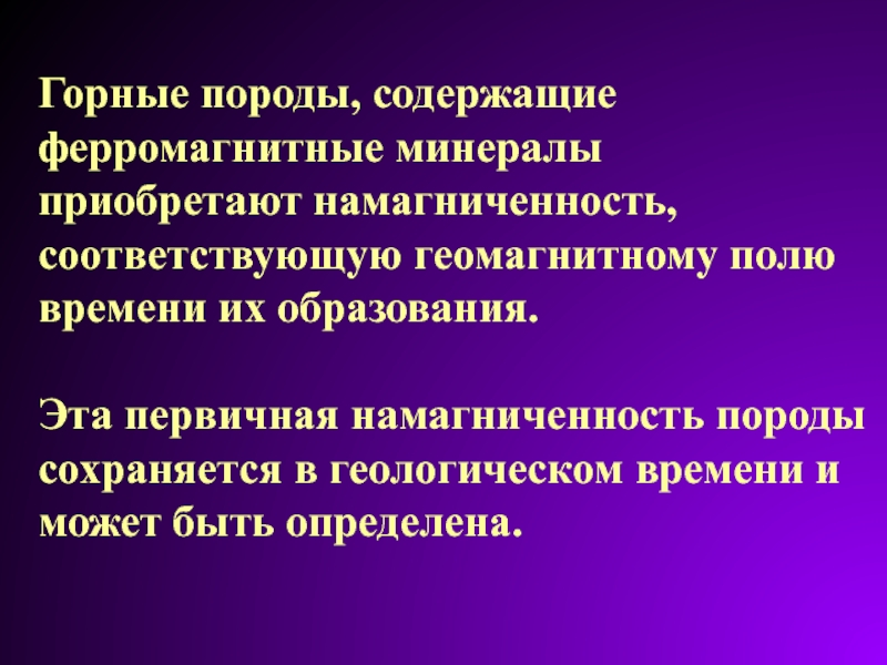Слайд 54Горные породы, содержащие ферромагнитные минералы приобретают намагниченность, соответствующую геомагнитному полю