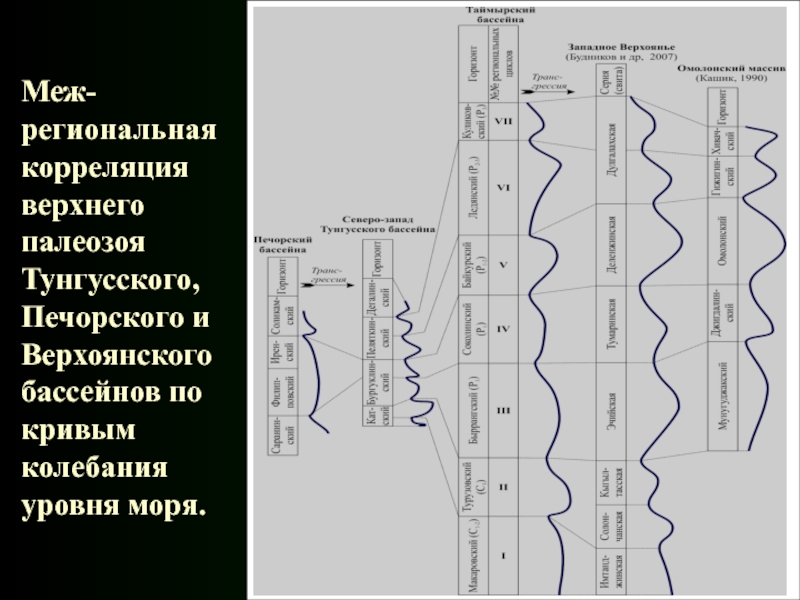 Слайд 45Меж-региональная корреляция верхнего палеозоя Тунгусского, Печорского и Верхоянского бассейнов по