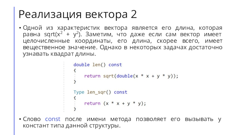 Для решения задач определяются структуры, описывающие точку и вектора, после чего реализуется алгоритм, который уже не содержит в себе координатного метода.