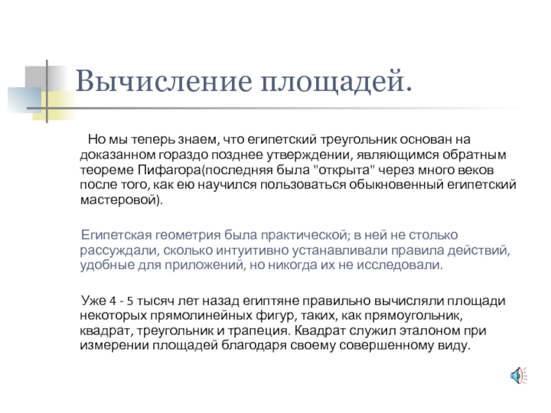 Египетская геометрия была практической; в ней не столько рассуждали, сколько интуитивно устанавливали правила действий, удобные для приложений, но никогда их не исследовали.