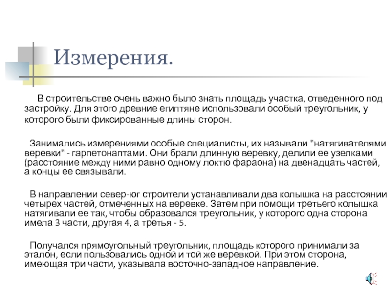 Занимались измерениями особые специалисты, их называли "натягивателями веревки" - гарпетонаптами. Они брали длинную веревку, делили ее узелками (расстояние между ними равно одному локтю фараона) на двенадцать частей, а концы ее связывали.