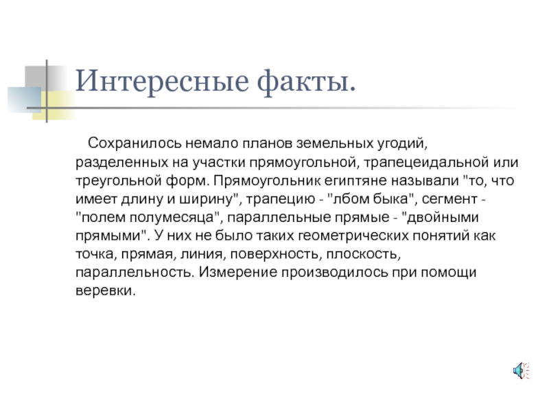 называли "то, что имеет длину и ширину", трапецию - "лбом быка", сегмент - "полем полумесяца", параллельные прямые - "двойными прямыми". У них не было таких геометрических понятий как точка, прямая, линия, поверхность, плоскость, параллельность. Измерение производилось при помощи веревки.
