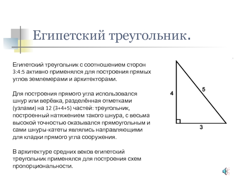 Египетский треугольник с соотношением сторон 3:4:5 активно применялся для