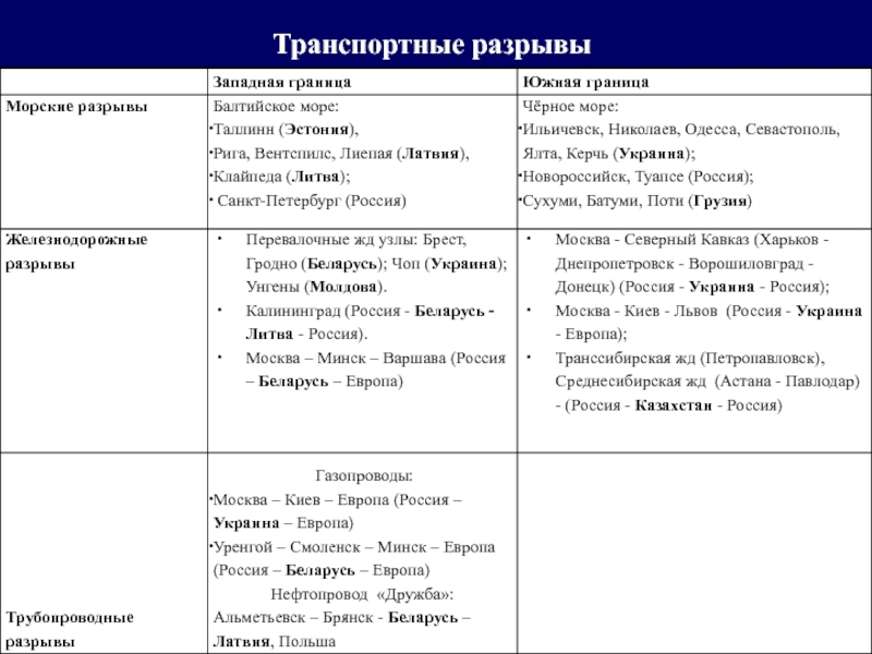 Транспортные разрывы на западе и юге (морские порты, нефтепроводы, газопроводы, железнодорожный транспорт, линии электропередач)
