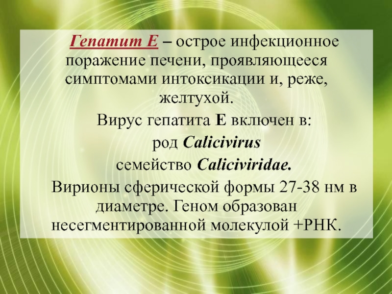 Слайд 69Гепатит Е – острое инфекционное поражение печени, проявляющееся симптомами интоксикации