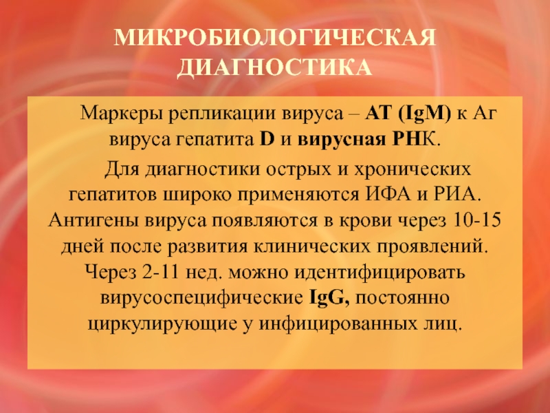 начиная с 10-12 суток после инфицирования. Диагностические титры сохраняются в течение 1-2 мес. АТ класса IgG появляются через месяц после перенесенного заболевания. РНК вируса выявляют в реакциях ПЦР и молекулярной гибридизации. РНК вируса можно выявлять с первых суток заболевания, однако в желтушном периоде обнаружить ее невозможно.