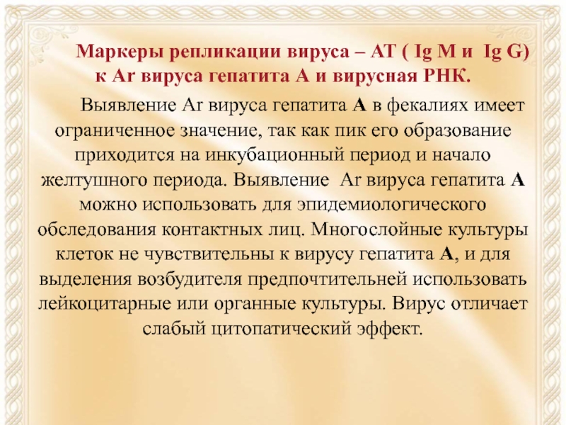 Ar вируса гепатита А в фекалиях имеет ограниченное значение, так как пик его образование приходится на инкубационный период и начало желтушного периода. Выявление Ar вируса гепатита А можно использовать для эпидемиологического обследования контактных лиц. Многослойные культуры клеток не чувствительны к вирусу гепатита А, и для выделения возбудителя предпочтительней использовать лейкоцитарные или органные культуры. Вирус отличает слабый цитопатический эффект.