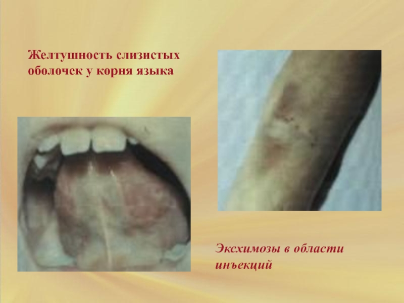 Слайд 77Желтушность слизистых оболочек у корня языка